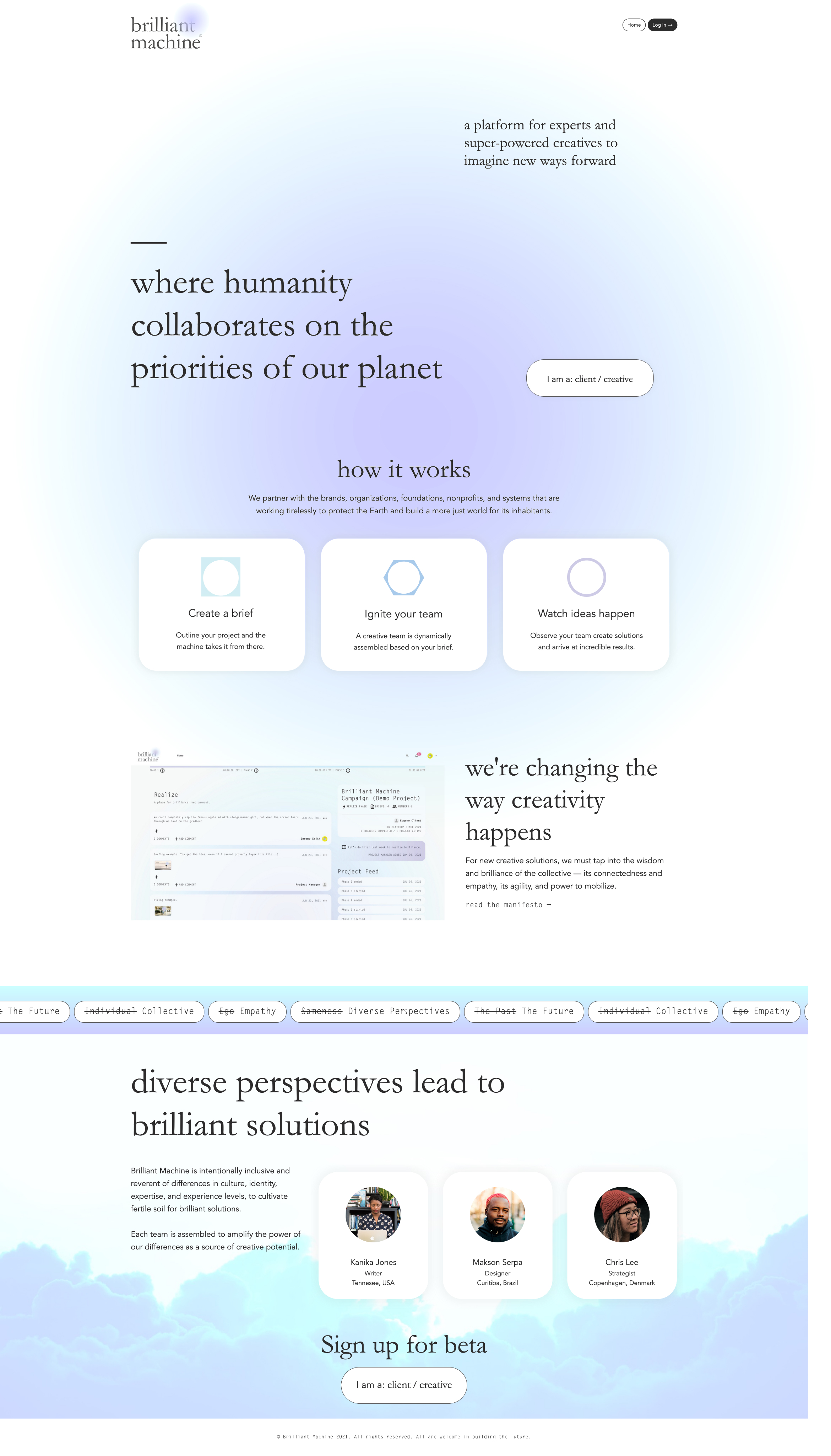 Brilliant Machine is designed to solve today’s most pressing challenges by tapping into the collective brilliance of its teams. The platform creates fertile ground for innovation through empathy, connectedness, and agility, while prioritizing sustainable and non-exploitative practices. This approach ensures that every solution is as unique as the challenge it addresses, leading to extraordinary results through the power of collaboration and creativity.Landing page
